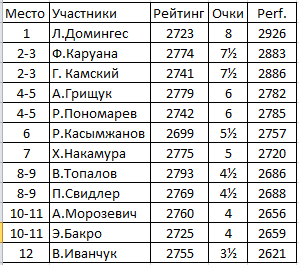 Турнир был странный. Три первых призера показали результат выше, чем ожидаемый результат Карлсена в этом турнире, играй он вместо Домингеса. Поэтому весь этот турнир, включая результат Домингеса в нем, я считаю "ошибкой эксперимента". Будущее покажет, насколько я прав-не прав.