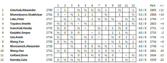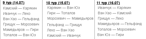 Примерно одинаковый финиш у Шаха и Грищука: обоим предстоит сыграть с Моро и Абрамычем, а Гири и Леко почти равны по силе