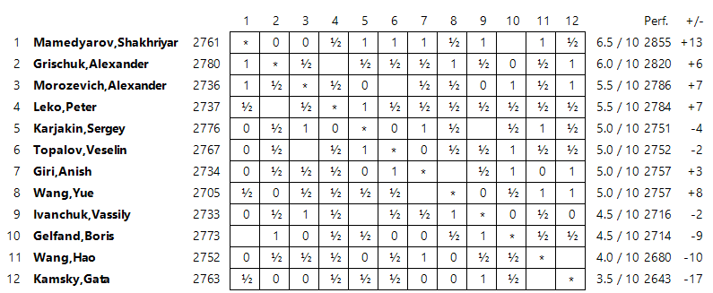 4-5.Леко , Карякин 6 6-7. Ван Юэ , Гири по 5,5 8-10. Ван Хао , Гельфанд , Топалов по 5 11.Иванчук 4,5 12 Камский 3,5. |