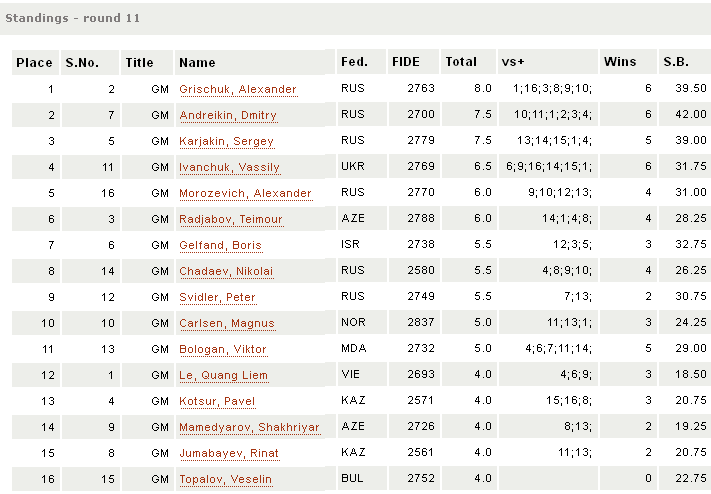 ну вот если бы он не проигрывал какие-то тупые партии типа как Иванчуку то мог бы явно в лидерах идти так как способен обыграть любого но игра абсолютно неровная, нечемпионская какая-то |