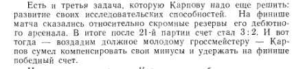 | Преимущества Карпова по сравнению с другими шахматистами (бытовые условия, международные турниры, и т.д.) воспринимаются абсолютно заслуженными. |