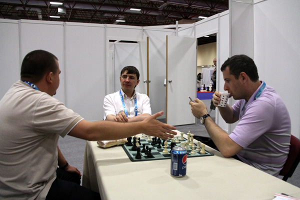 Положение лидирующих команд. Мужчины: США и Китай - по 15 (26), Армения - 15 (23,5), Россия - 15 (23), Нидерланды - 14 (25), Украина - 14 (23), Аргентина - 14 (22,5).