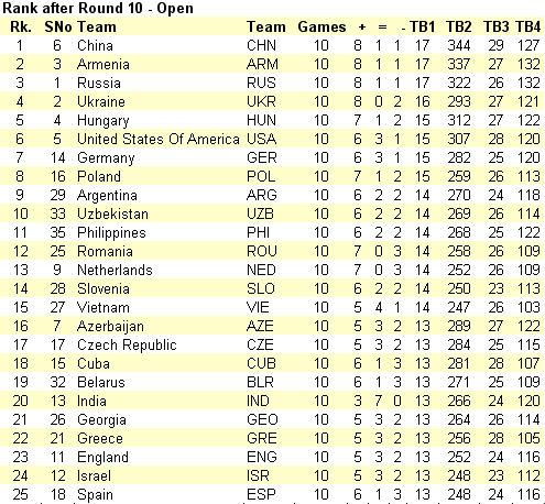 yuriymos: Ессентуки: Хороший расклад, тут и фарта особенного Армении не надо, чтобы стать Чемпионами. Украина выиграет у Китая (или накрайняк ничья), Армения обыграет Венгрию 2.5:1.5 (Аронян черными выиграет у Леко), а Россия вряд ли разгромит Германию. Итого: Армения и Россия - по 19 очков (но Армения первая по доп. показателям), Украина - третья с 18 очками.