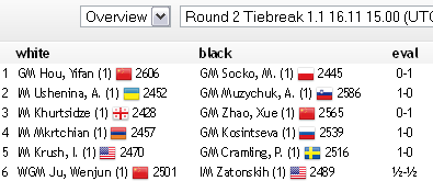 | после первого круга укранки без потерь.во втором,увы,выбыла лагно.прошли жукова (2-0 против конеру!) и м.музычук.ушениной предстоит тай-брейк с а.музычук. |