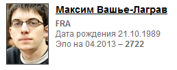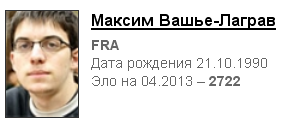 Кто бы мог подумать, что после половины турнира французы будут иметь больше очков, чем русские. Один Вашье-Лаграв имеет больше, чем недавние (русские) претенденты в сумме. Кстати, мне как человеку далековатому от шахмат, было бы интересно послушать мнение форумчан о г-не Вашье. На мой мало посвящённый взгляд он несколько менее раскручен (распиарен), чем некоторые другие молодые супер-гроссы, хотя играет возможно не хуже. Но я не утверждаю, а спрашиваю.