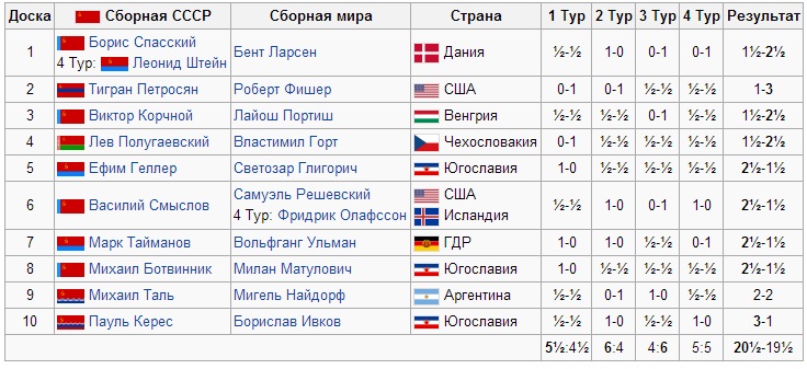 В 1970 гду, как известно, состоялся матч СССР - команда остального мира. Самым трудным для советских было утрясти порядок досок в нашей команде. Ведь в ней играл весь цвет советских шахмат. Вся, так сказать, советская шахматная школа. Возмсжно, самая сильная команда в истории шахмат. Борясь за более высокую доску, некоторые гроссмейстеры совершенно забывали о патриотизме. Они думали, прежде всего, о своем престиже. А в команде остального мира даже капризный Фишер спокойно отдал первую доску Ларсену. Никто от патриотизма не умирал, и, кстати говоря, команда СССР выиграла с превесом только в одно очко, хотя, несомненно, она была несравненно представительнее.