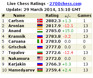 13 Svidler .......... RUS 2755,8 . -2,2 ...... 14