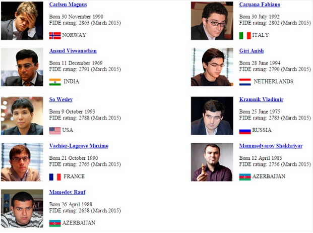 Как передает azerisport.com, имена выдающихся шахматных мастеров, которые примут участие в этом престижном турнире уже известны. Впервые три чемпиона мира - действующий чемпион мира Магнус Карлсен (Норвегия, 2863), экс-чемпион мира Вишванатан Ананд (Индия, 2791) и Владимир Крамник (Россия, 2783) будут соревноваться в турнире в Азербайджане, а также 2-ой в рейтинге ФИДЕ Фабиано Каруана (Италия, 2802), Аниш Гири (Нидерланды, 2790), Уэсли Со (США, 2788), чемпион Европы Шахрияр Мамедьяров (13-ый в рейтинге ФИДЕ, 2756), Теймур Раджабов (20, 2738) и последний победитель чемпионата Азербайджана Рауф Мамедов (92-й, 2658) примут участие на турнире.