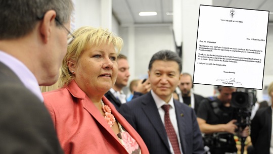 Нет, не было и намёка капризности в сложной дилемме Карлсена в отношении проведения матча в Сочи. Какая уж там капризность Магнуса, если Премьер-министр Норвегии Эрна Солберг чувствует себя вынужденной отказаться от приглашения Илюмжинова сделать первый ход в матче с мотивировкой о том, что "нынешние события на международной арене не позволяют мне посещать спортивные соревнования в Российской Федерации". Отказ впрочем выдержан, естественно, в дружественной форме: "У меня остались приятные воспоминания о нашей встрече на недавней Олимпиаде в Тромсё, и я хочу воспользоваться возможностью, чтобы поздравить Вас с переизбранием на пост президента ФИДЕ".