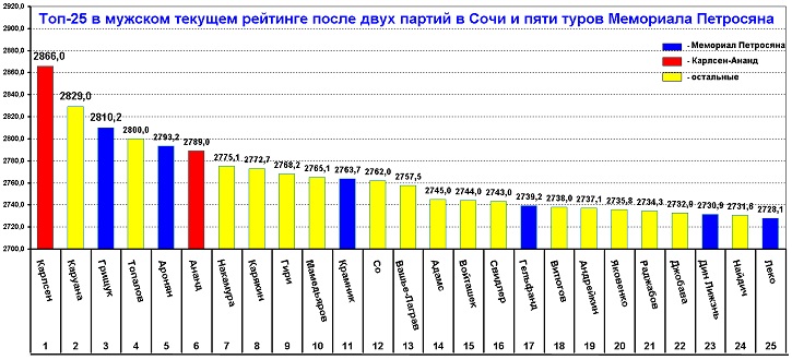 Двое из них, как раз бывшие фавориты на ТП в Х-М ( по мнению Каспарова, и многих других) сейчас играют на мемориале Петросяна и показывают Ананду, как надо играть с Магнусом. |