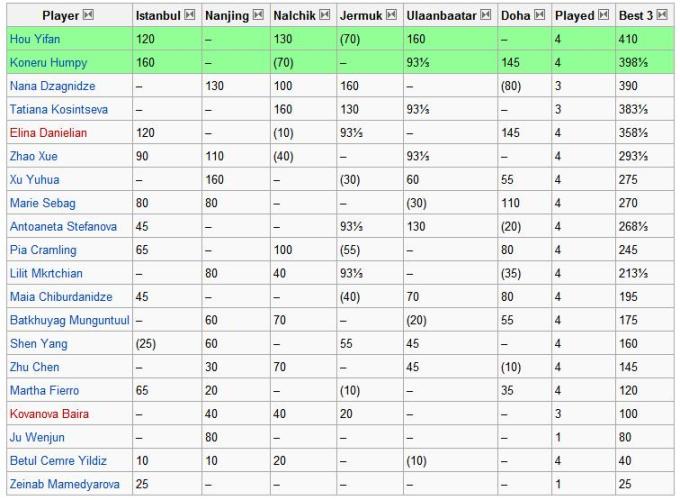 | Конеру и Даниелян делят первое место в Дохе, несмотря на то, что у Конеру победа в личной встрече и лучший коэфициент. Обе прибавляют по 145 очков в общем зачёте, и получают по 5.625 ? |