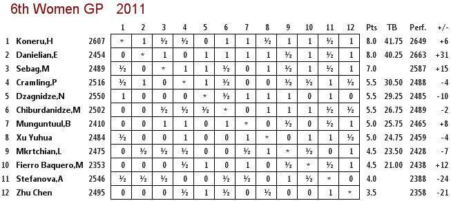 Хампи Конеру, занявшая в Гран-при ФИДЕ второе место, завоевала право сыграть матч на мировое первенство с чемпионкой мира и обладательницей Гран-при Хоу Ифань. [источник: qatar2011.fide.com] |