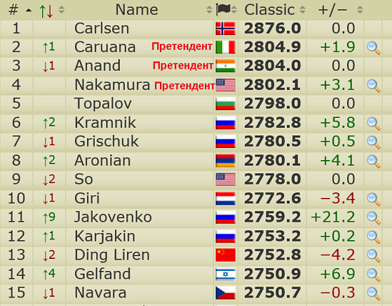 Почитатель:Так или иначе, выход Каруаны и Накамуры зажигает зеленый свет Грищуку. Но неожиданно в гонке средних рейтингов засветило и Крамнику! А также и Ароняну! И даже немного Со с Гири...