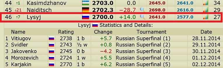 Хотелось бы, чтобы было так. Я привык, что нее около 2500 уже долгое время, а тут значительно поболе будет. Но, честно говоря, за прошедшие 10 лет все-таки должна была произойти инфляция рейтинга, думаю, довольно значительная (где-то читал по 3-4 пункта в год). |