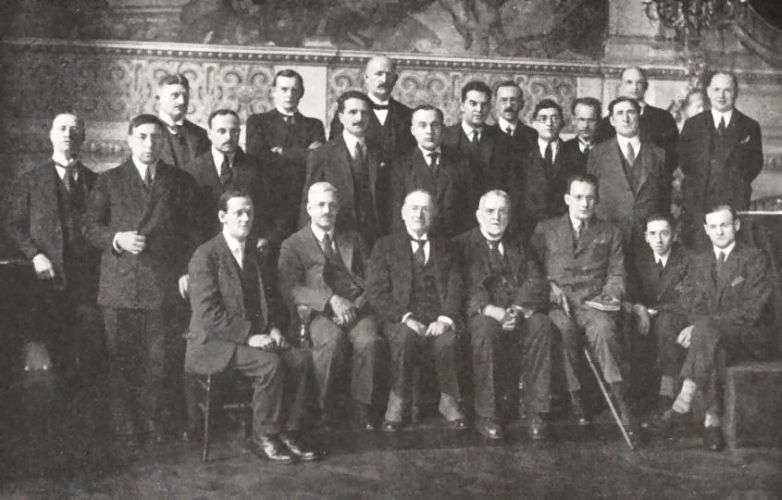 | Baden-Baden 1925. De pie: Mieses, Rubinstein, Carls (detrás), Rabinóvich, Alekhine, Rosselli, te Kolsté, Bogoljúbow, Réti, Tréybal, Torre, Nimzówitsch, Márshall, Tartakówer y Spiélmann; Sentados: Yates, Thomas, Tárrasch, Metger, Grünfeld, Colle y Sämisch. Fuente: Tabla de Flandes. |