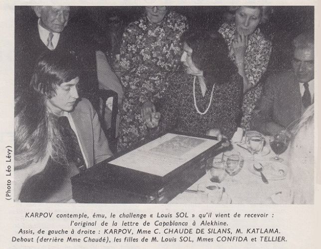 На этом приёме, собравшем около сотни гостей, среди которых, в частности, были замечены господа В. Свистунов, советник посольства СССР, Планше, синдик Совета Парижа, Ги Дессон, вице-президент Ассоциации «Франция — СССР», генерал Пуяд, герой Советского Союза, бывший командир прославленной эскадрильи «Нормандия-Неман», и мадам Шоде де Силан, месье Бернар Шоде вручил А. Карпову, явно удивлённому и тронутому, трофей «Challenge Louis Sol».
