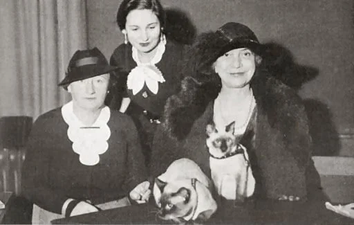 | Фотография сделана около 1937 года, на ней жены Кмоха и Флора, а справа — Грейс с кошками Алехина. |