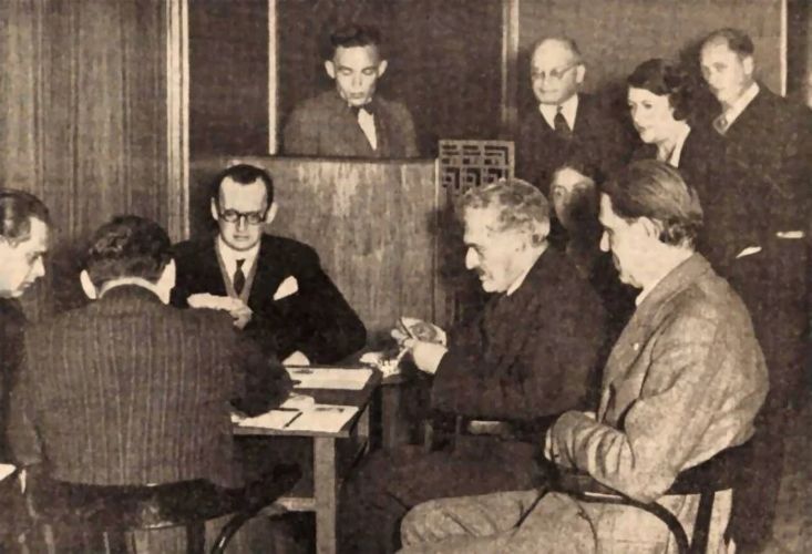 Фотография из голландской газеты «Algemeen Handelsblad» (19 октября 1935 г.) после 7-й партии матча Алехин-Эйве. Сидят и играют в бридж: Ландау (секундант Алехина), ? (повернувшись спиной), Алехин и Ласкер, за ними наблюдает Мароци (организатор и секундант Эйве), а на заднем плане в очках стоит Тартаковер. Источник: Chess Marginalia .