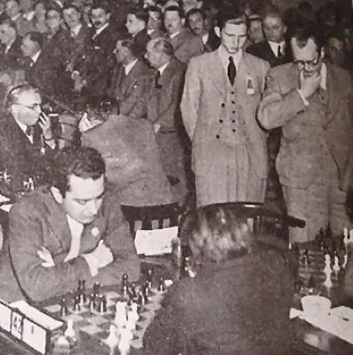 | Буэнос-Айрес 1939. Молодой Керес (23 года) и Алехин наблюдают за играми раунда. Источник: Spraggett on Chess |