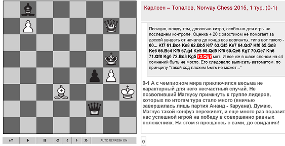 Jacob08: 15.11.2013 Виктор Львович Корчной - единственный шахматист в мире, которому нынешний Претендент проиграл в классике, просрочив время. Дело было в новогоднем 2004/2005 г.г. турнире Drammen International Chess Festival в Норвегии (средний 2599), Карлсену только-только (30/11-2004) стукнуло 14 лет и, по красочному выражению Ю.Васильева, это был период «голубоватый-с-капюшоном».