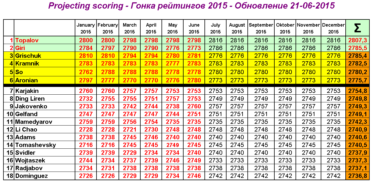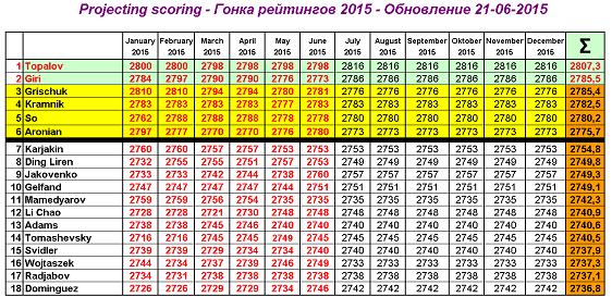 Почитатель: Любители прогнозов, основанных на предположении о неизменности текущих рейтингов, не должны пройти мимо этого факта. На данный момент (после 5-го тура "Ставангера") прогноз на 1 декабря суммы рейтингов из двенадцати рейтинг-листов (суммы! из которой делением на 12 и определяется средний рейтинг) составляет: