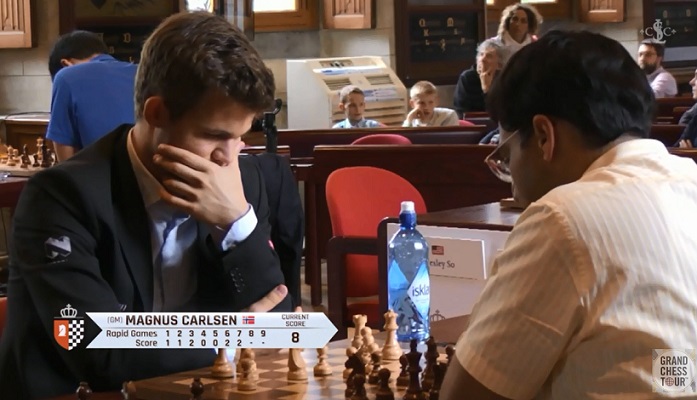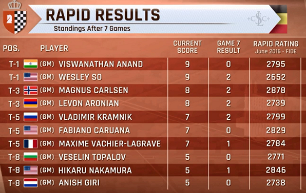 Карлсен 12 (18), Со 11, Аронян, Ананд - по 10, Каруана 9, Топалов, Гири, Вашье-Лаграв - по 8, Крамник 7, Накамура 6. Завтра и в понедельник - блицтурнир в два круга.