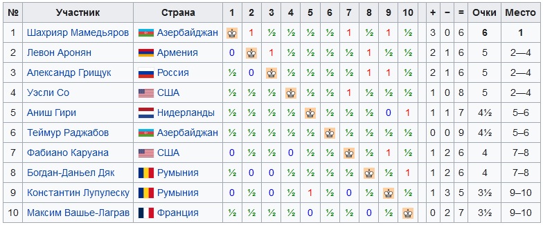 Я вынужден был следить по службе. Выиграл Со, за счёт победы в парижском рапидо-блице и дележе второго-четвёртого в обоих классических турнирах. По игре, как почти всегда у него в последние годы - скукота. |