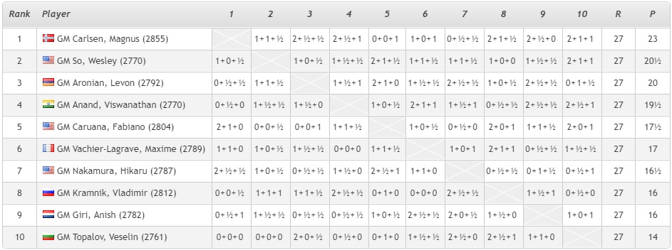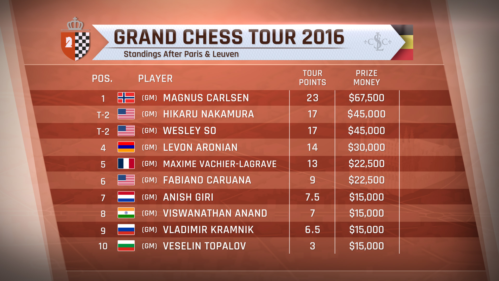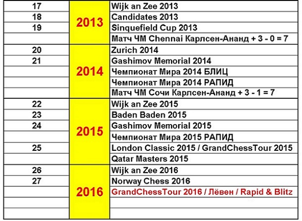 Учёт лишь ТРЁХ наиболее успешных выступлений в четырёх турнирах GCT-2016 создаёт - на радость всех задействованных - дополнительную, существенную интригу в выявлении победителя серии. До окончания Sinquefield Cup об этом ИМХО даже приблизительно судить сложно. Для того же Накамуры этот турнир в Лёвене, например, может вообще "выпасть из обоймы" при успехе в Сент-Луисе и Лондоне. Лишь Ананд, и, при случае, Карлсен не будут участвовать в этой двойной бухгалтерии. И никто, включая Карлсена, не знает - будет ли он играть в Лондоне. ))