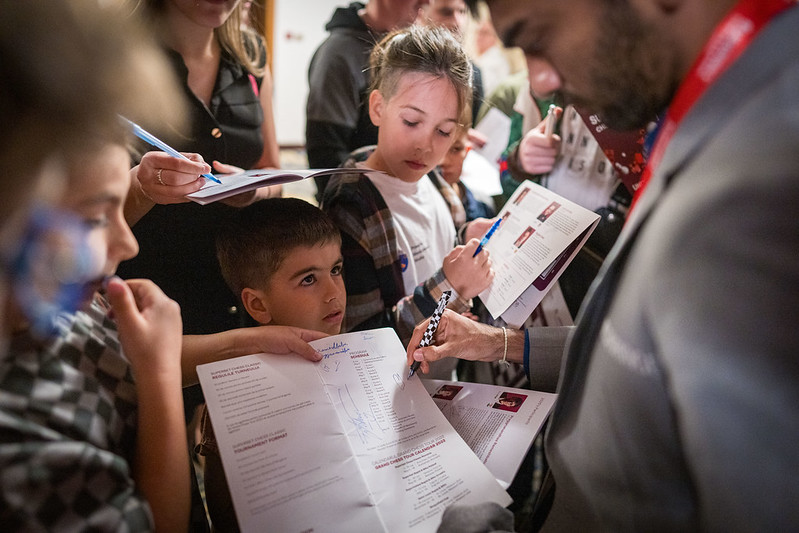 Легендарный 13-й чемпион мира по шахматам сделал первый символический ход в партии между Богданом-Даниэлем Дяком и Прагнанандхой Рамешбабу, открывая 4-й тур.