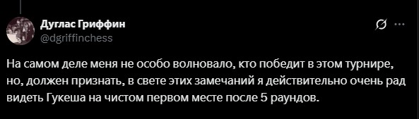 «Вся заслуга Гукеша; он играет хорошо и не упускает свой шанс. Сейчас у него все получается невероятно хорошо. Ему предстоит долгий путь на турнире, но выиграть пять игр подряд — это нелегкое дело».