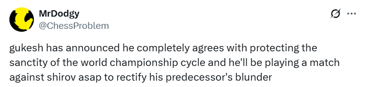gukesh has announced he completely agrees with protecting the sanctity of the world championship cycle and he'll be playing a match against shirov asap to rectify his predecessor's blunder