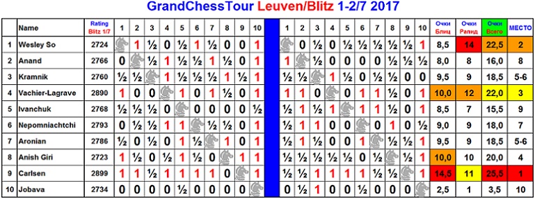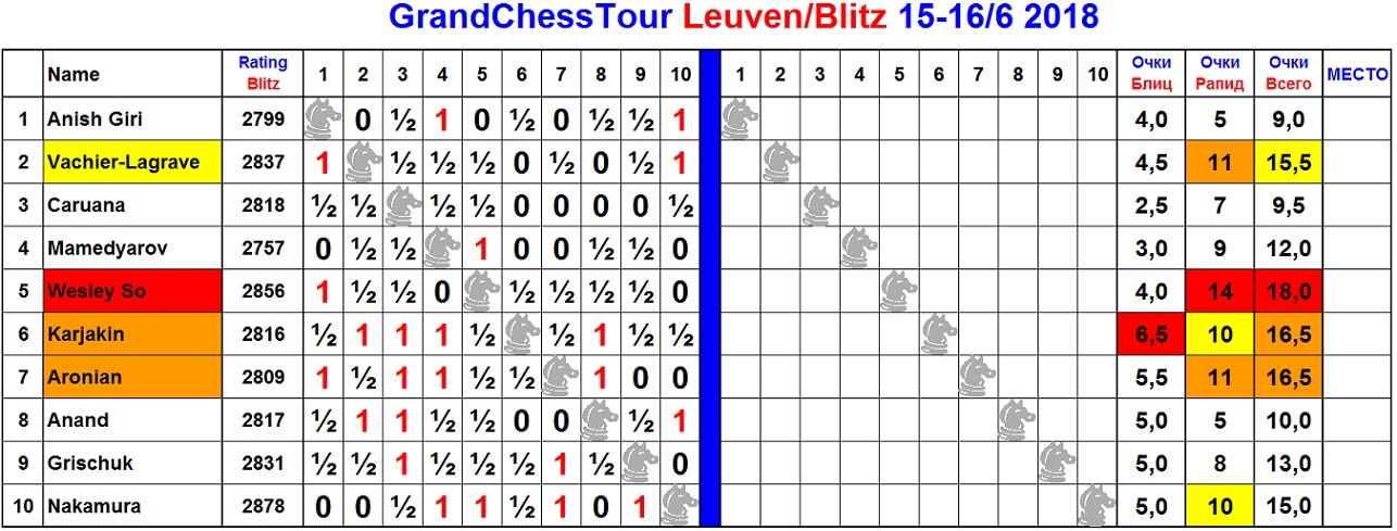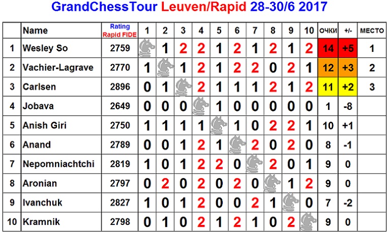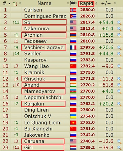 Рапид. Итоги. 1. Со – 14; 2-3. Вашье-Лаграв, Аронян – по 11; 4-5. Карякин, Накамура – по 10; 6. Мамедьяров – 9; 7. Грищук – 8; 8. Каруана – 7; 9-10. Ананд, Гири – по 5.