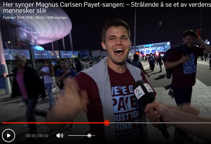 Магнус является давним болельщиком полузащитника сборной Франции Димитри Пайета, в английской лиге выступающего за West Ham, забившего вчера победный гол. Когда норвежское TV2 после трансляции засекло чемпиона, в приподнятом настроении возвращающегося со стадиона, то Карлсен в восторге спел песню болельщиков, прославляющую футболиста, признанного к тому же лучшим игроком матча - см. короткое видео.
