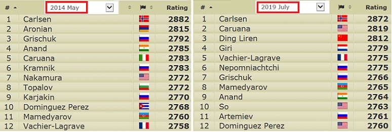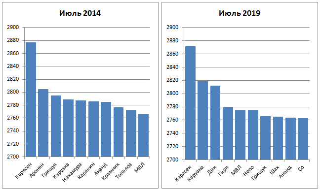 | Blackbird22: кстати, кажется, что средний рейтинг топ-10 сейчас ниже, чем пару лет назад. А если не считать Магнуса (хотя вряд ли это корректно), то это точно так |