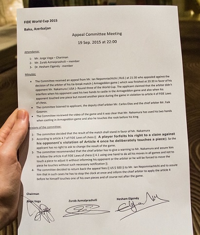 Вообще-то в правилах явное противоречие. Согласно 12.2a, судья должен обеспечить честную игру. Следовательно, судья должен был вмешаться, заставить Накамуру сделать ход ладьей и, возможно, наложить наказание согласно 12.9 (от предупреждения до исключения из турнира ). А согласно 12.6, судья не должен вмешиваться в партию кроме случаев, описанных в правилах (с чем, в частности, и связан пункт 4.8). Вот и понимай как хочешь . |