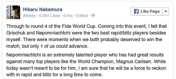 Думаю, что про "интеллигентность" Непомнящего говорить не стоит, равно как и о "вызывающем поведении Накамуры" - все их сознательные эпатажные выходки уже в прошлом. Просто хочется напомнить, что шахматы - это не бокс: тут совершенно по-иному работает нервная система, и даёт она сбой зачастую очень даже неожиданно для самого игрока. Можно вспомнить, например, как Василий Иванчук однажды "послал" судью, сделавшего ему замечание во время партии. Судья промолчал, тем более что Василий Михайлович всё же скорректировал свое поведение, а после партии, разумеется, извинился. О Фишере я даже и не говорю.