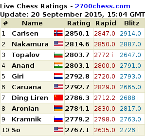 С точки зрения ситуации в Топ-10 рейтинга лишь Хикару пытается что-то, и, разумеется весьма здорово, ”изобразить”. А вот почти все остальные ”штурмовики высот” - Веселин, Виши, Фабиано и др. - как то на удивление дружно начали выпадать в осадок), выходя на заранее подготовленные позиции на рубеже 2800. Ощущение, что ещё пара турниров, и картинка станет походить на прошлую осень после Сент-Луиса 2014, причем в роли догоняющего (Фабиано) начнёт теперь выступать Хикару, а у целой группы других конкурентов Магнуса было тогда (условно) - что-то вроде 2799. |