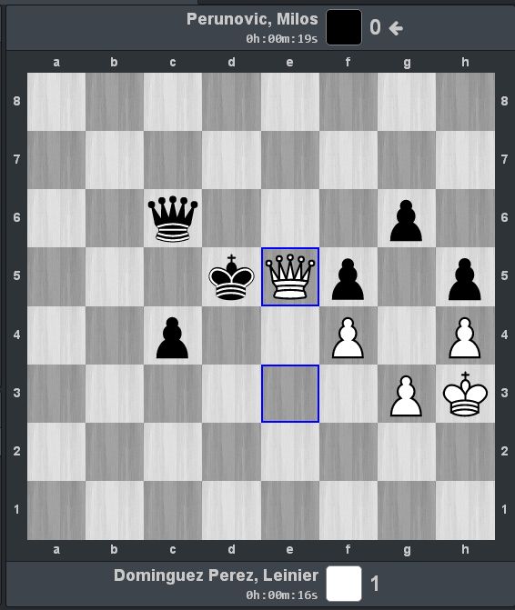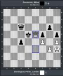 Но наверно самым сильным впечатлением был эполетный мат в центре доски, поставленный Домингесом в проигранном ферзевом эндшпиле. Причем лишняя пешка стала, по иронии судьбы, роковой эполетой.)