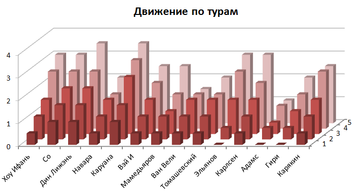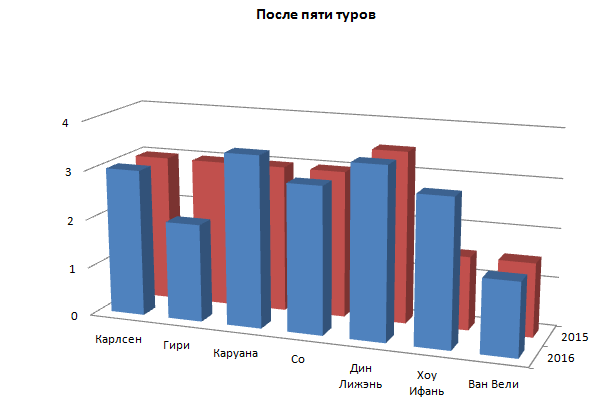 После пятого тура Ван Вели (1,5) идет по прошлогоднему графику. Аналогично - Карлсен (3), Со (3) и Дин Лижэнь (3,5).