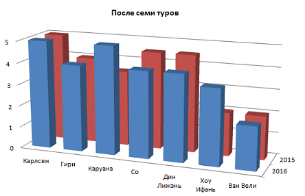 В прошлом году после 7-го тура (и четырех рядовых побед) Карлсен с пятью очками догнал лидировавшего со старта Иванчука (после пятой победы в восьмом вышел в единоличные лидеры)