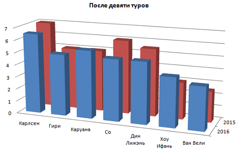 А после девятого Карлсен лидировал уже с отрывом в очко от второго. И сейчас - то же самое, только сзади не Со, а Каруана.