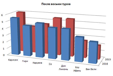 Почитатель: Как и в прошлом году, восьмой тур Вейка принес Карлсену единоличное лидерство. Только теперь не пришлось для этого выигрывать пять партий подряд, хватило и трех.
