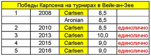 - Карлсен одержал единоличные победы в трёх последних турнирах в Вейк-ан-Зее, в которых он принимал участие.