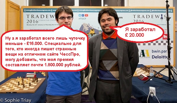 Тут я неправ немного. Гупта и Мазе получат призы покрупнее (3,000 и 2,500) в рейтинговой группе 2550-2649, Анна (!!) - 2,500 в группе 2450-2549. Так что на остальных упадет побольше, чем по 633.