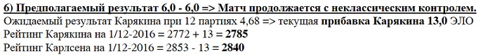 Что ж, этот теоретически возможный промежуточный результат, как и многие другие результаты, был рассмотрен в обзоре "Рейтинговые перспективы" матча, который я давал несколько недель назад. Как видим, при этом Карлсен потеряет, а Карякин приобретёт 13 ЭЛО.