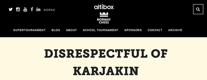 Это Вы где прочитали? Никакого официального приглашения Карякину в прошлом году не было. Было устное предложение (и устное же согласие) - при случайной встрече Карякина с одним из норвежских организаторов. Ещё в январе, в Вейке. (Турнир прошел в июне, о своем неучастии Карякин узнал в начале апреля, если не раньше).