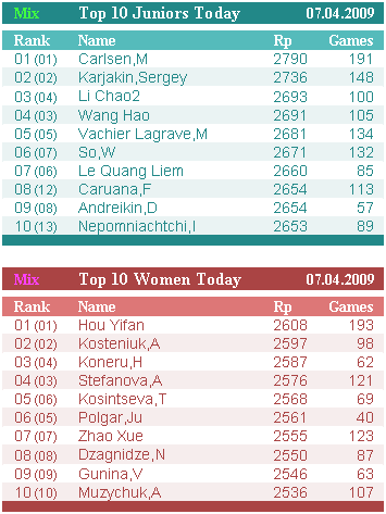 Продолжились потери Полгар, она опустилась с 6-й на 10-ю (!) позицию – 2542 Elo, и уже место в десятке неустойчиво, очень близко А.Музычук-2540.