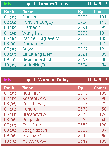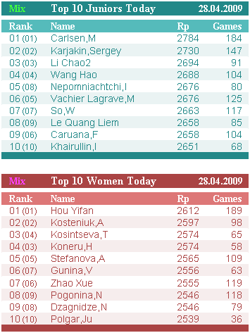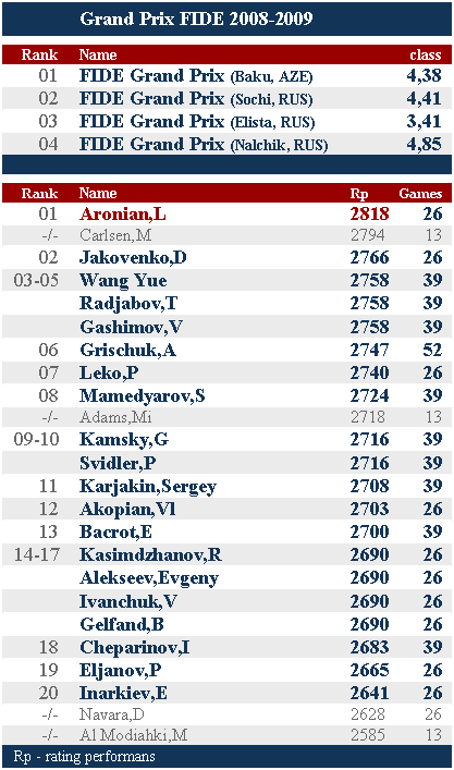Для определения класса и отбора турниров в CLASS-Tournaments 2009 ФИДЕ-списки не использую. Использую последнее до начала, и первое после окончание распределения годовых перфомансов в Top GrandMasters Today (Mix). |
