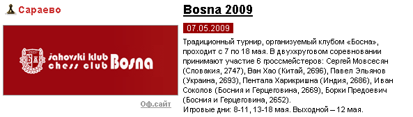 Сараево – класс перед началом 0,00 (критерий суров – нет представителей первой 30-ки, класс равен 0,00). По итогам турнира он может повысится, если кто-то из участников войдет в 30-ку. Но маловероятно, что превысит уровень 1,00, необходимый для попадания в CLASS-Tournaments 2009