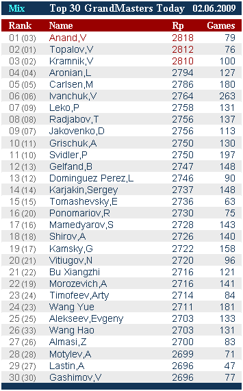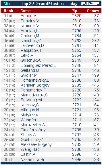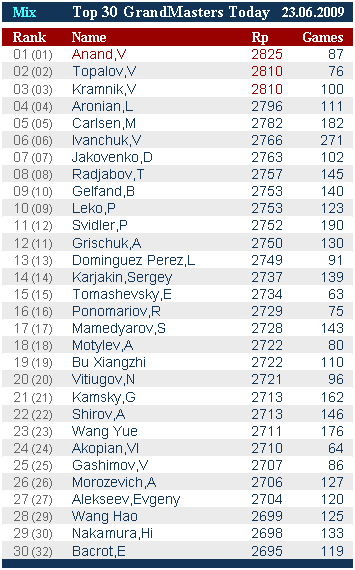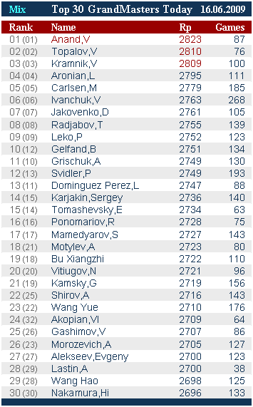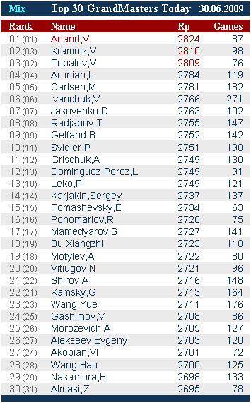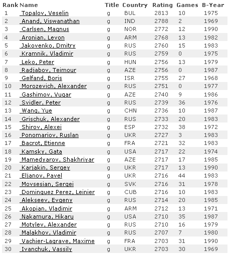 Крамник и Топалов поменялись местами – Крамник второй – 2810 Elo.